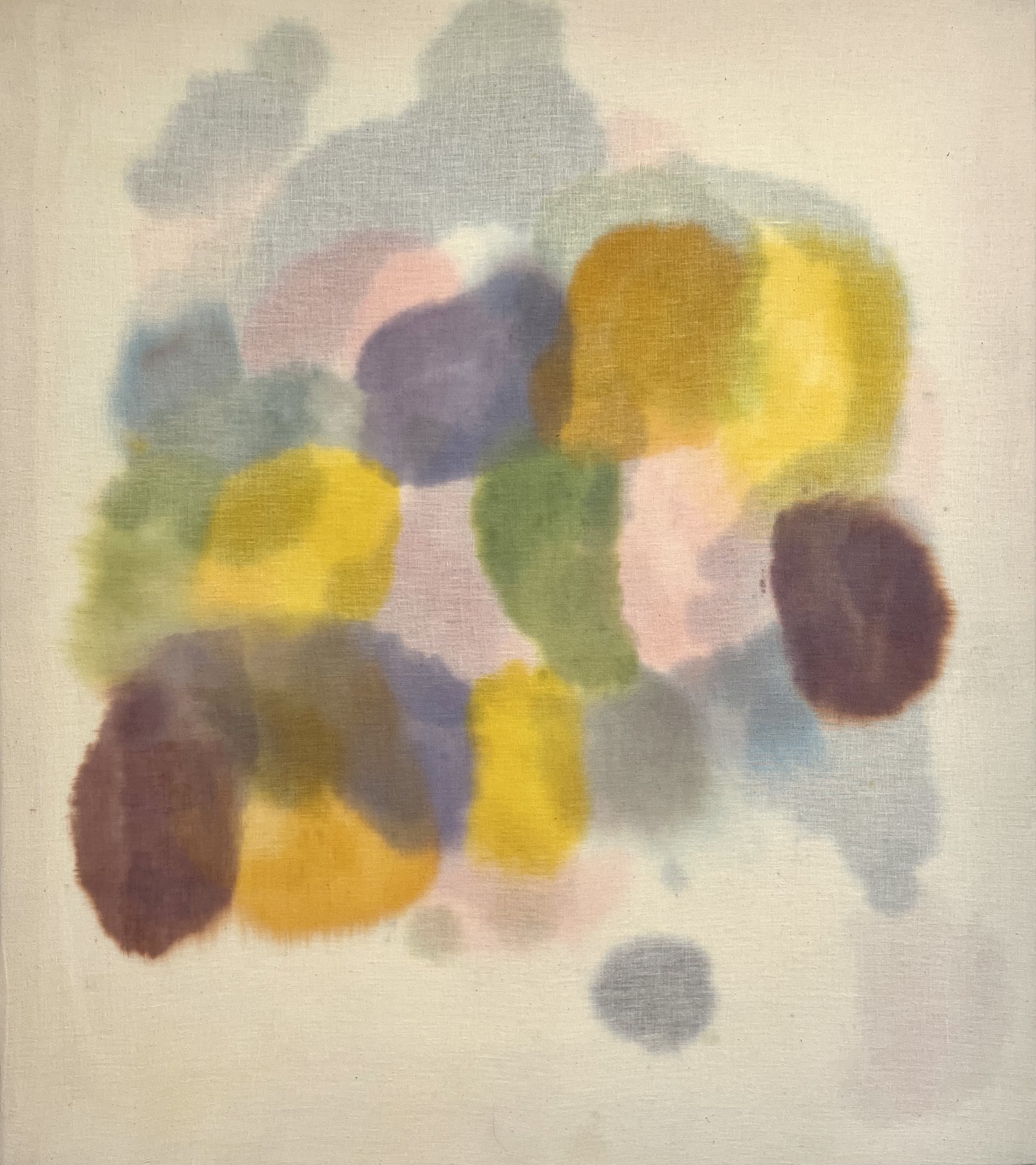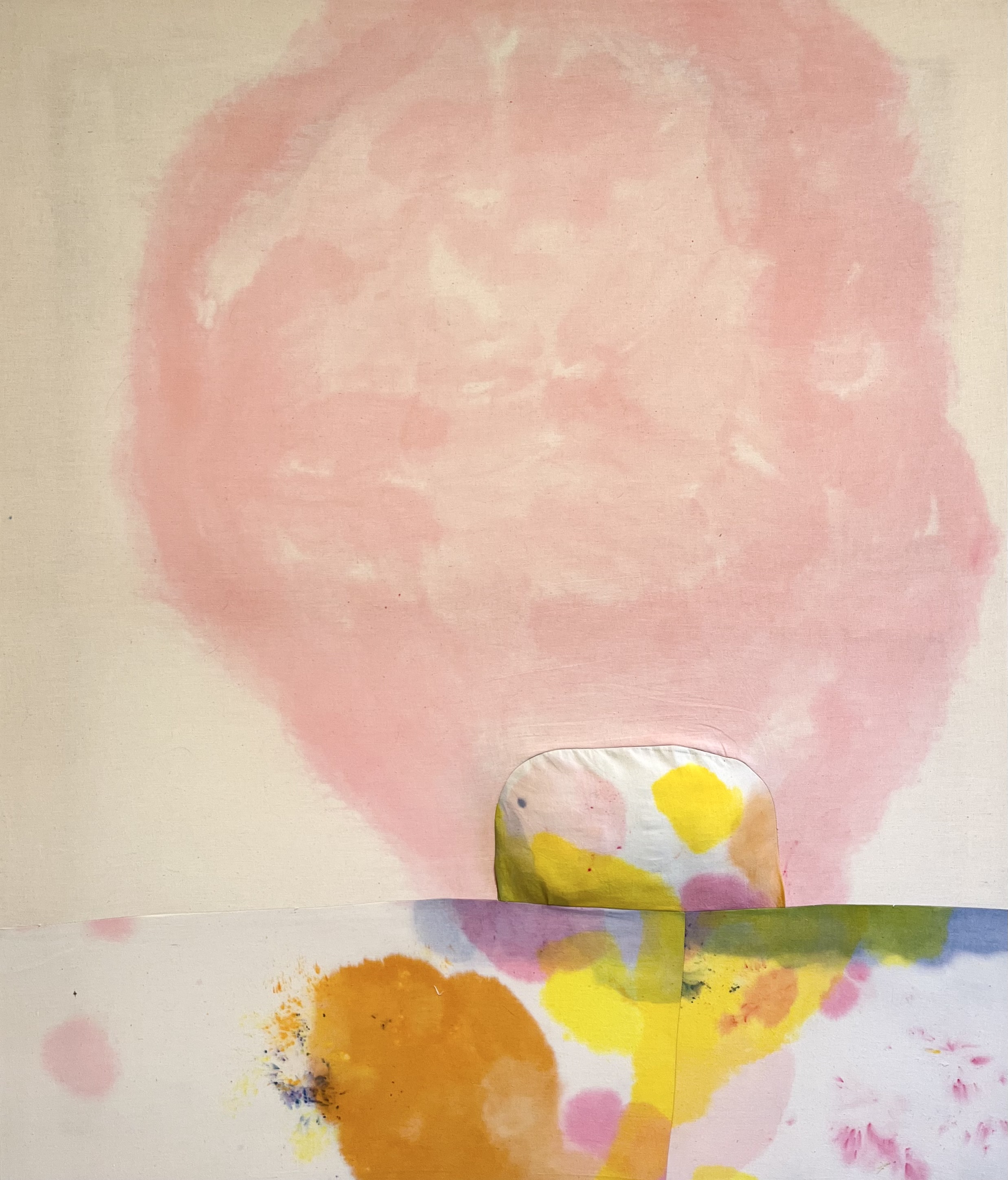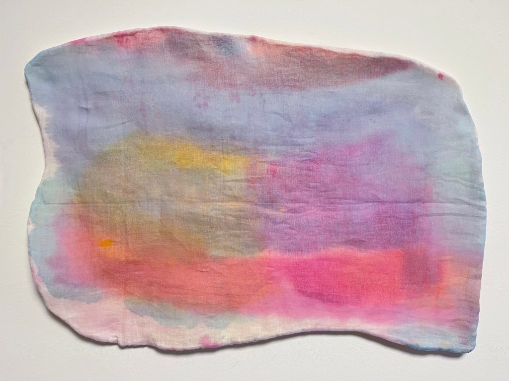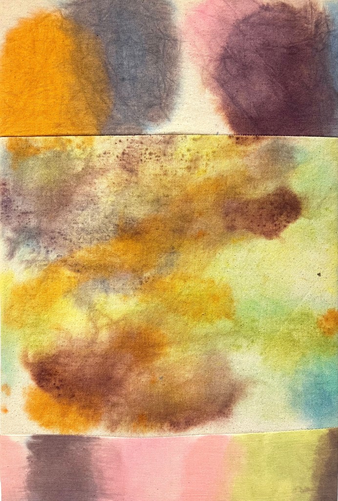 Hubba Bubba. Fabric dye and pigment on pieced calico, 90x120cm, 2025.All back to front. Fabric dye and sizing on canvas, 90×120 cm, 2025. Acoinoflightappears. Fabric dye, ink and acrylic on layered cotton, silk and muslin, 28x35cm, 2024/25.Untitled. Fabric dye and pigment on muslin and calico, 80x110cm, 2025.Above our heads. Fabric dye on pieced calico, 90x120cm, 2025.Back when I was younger. Fabric dye on pieced canvas, 30x50cm, 2025.